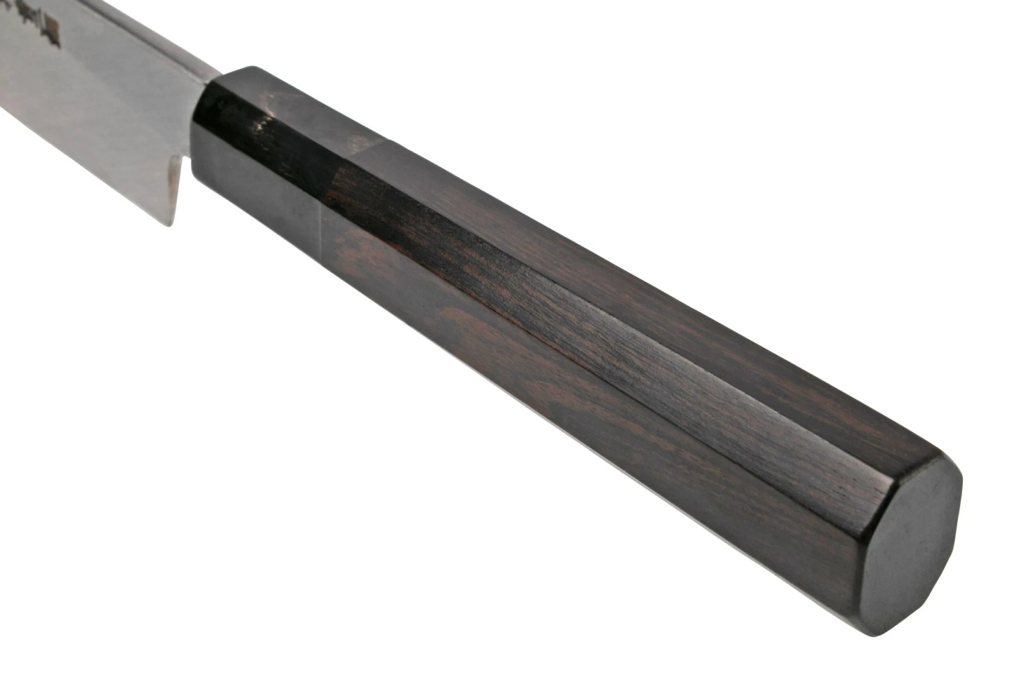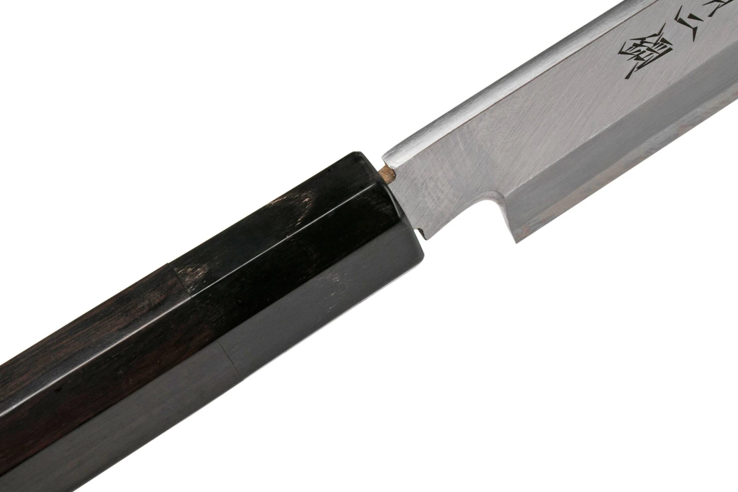Le yanagiba Sakai Takayuki Blue 2 Steel Japanese Style 01204 est un couteau de cuisine aiguisé d’un seul côté, pour couper des tranches de viande, de poisson ou de légumes. La longueur de la lame permet d’effectuer de longs mouvements de coupe. De quoi préparer des tranches ultra fines de viande, poisson ou légumes. C’est idéal pour les sushis ou les sashimis !