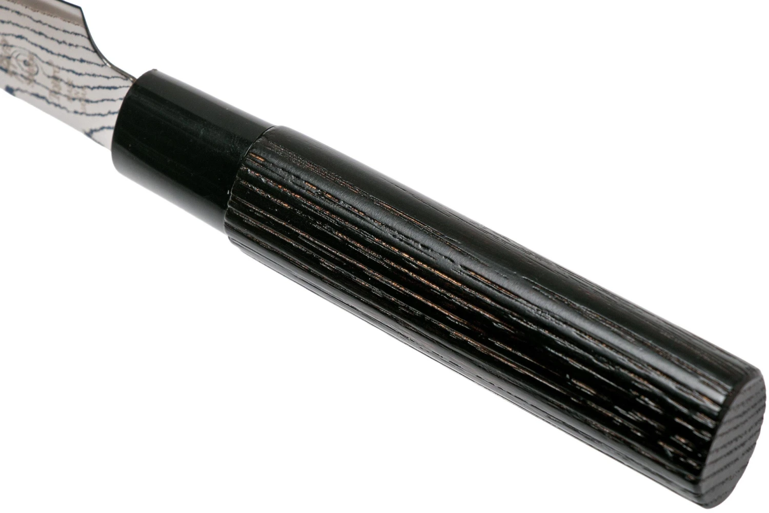 Le couteau d’office Tojiro Shippu Black damascus (Petty) 9 cm est modeste, tranchant et pratique. Le Petty est la version japonaise du couteau d’office européen. La lame de 9 cm de longueur est parfaite pour les petits travaux de coupe. La coupe droite permet d’utiliser ce couteau pour toute autre tâche de préparation culinaire.