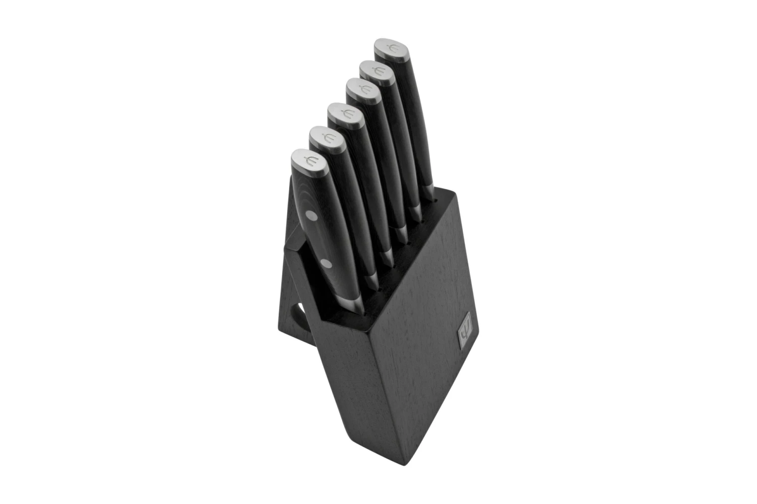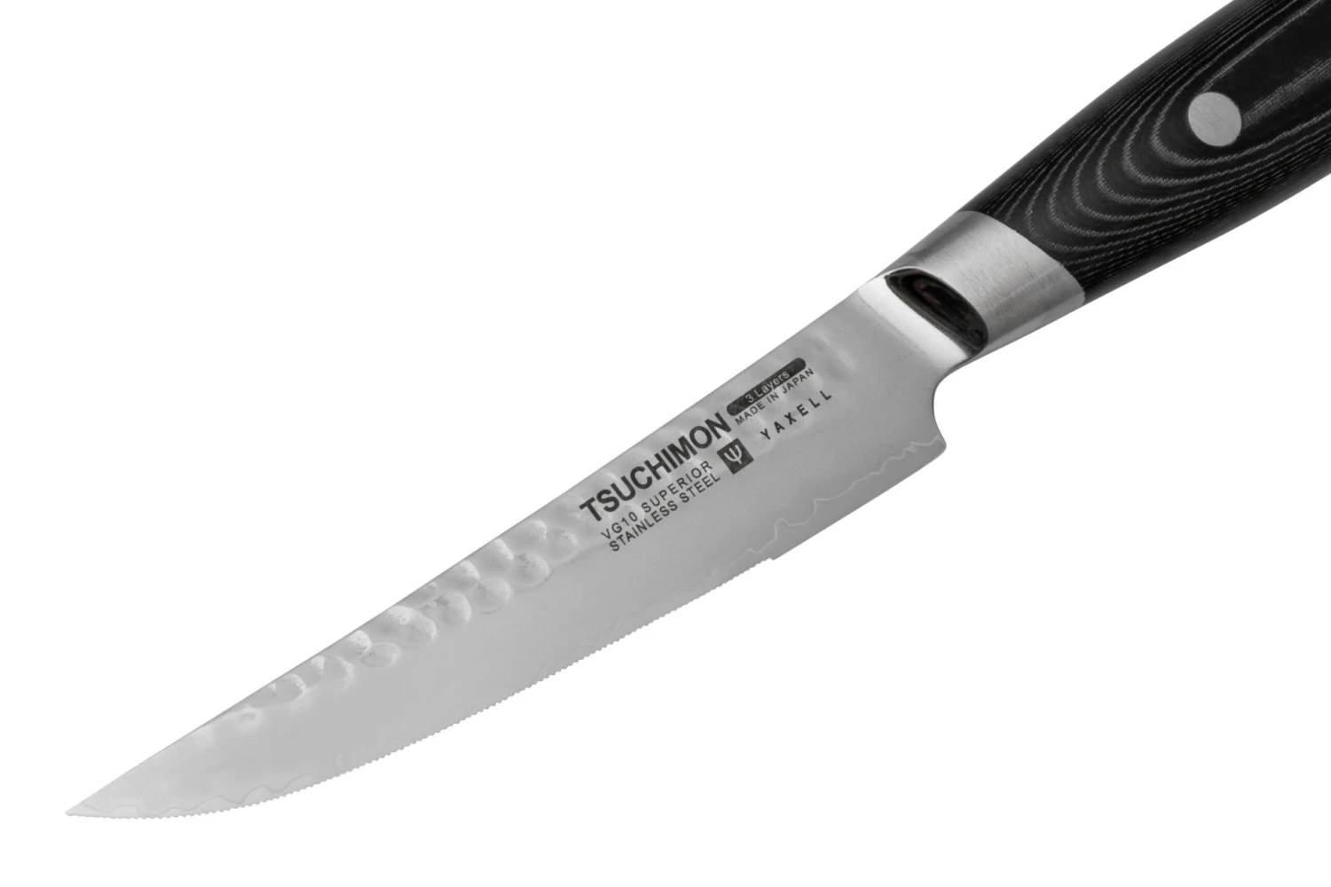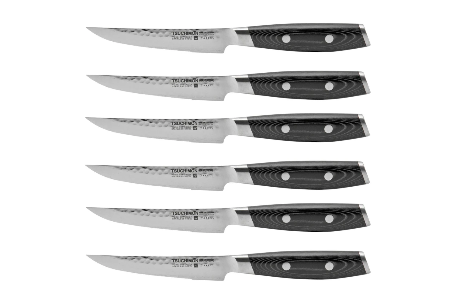 Le set de 6 couteaux à steak Yaxell Tsuchimon se compose de six couteaux à steak japonais élégants, à lame martelée, et d’un bloc à couteaux en bois de hêtre. Ces couteaux à steak sont dotés de toutes petites dents, ce qui leur permet de garder longtemps leur tranchant, et de couper la viande sans effort. Sympa à offrir, et encore plus sympa à recevoir !